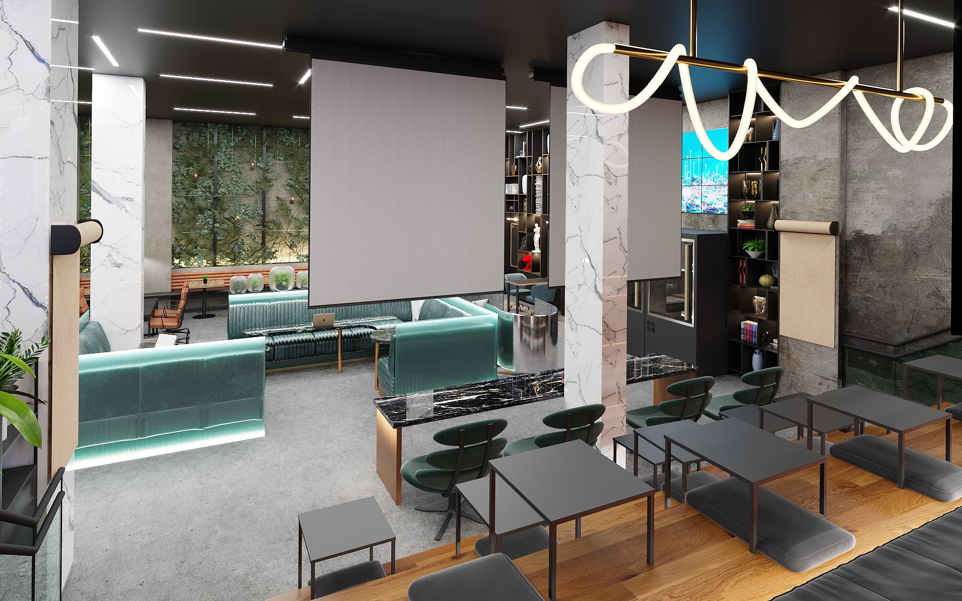 Black Box Café design embodies sophistication and warmth through its modern aesthetic and thoughtful design. With a sleek black and white color palette accented by touches of wood and greenery, the space exudes an inviting ambiance. From its cozy seating areas to its stylish barista station, every detail has been meticulously crafted to create a memorable coffeehouse experience for all. Black Box Café stands as a testament to CDB’s work in creating spaces that seamlessly blend functionality with elegance.